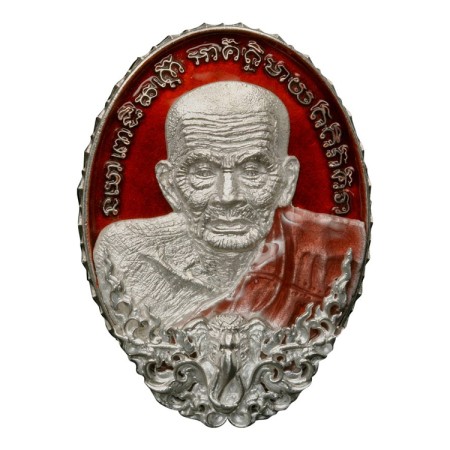 เหรียญหล่อรูปไข่หลวงปู่ทวดขอบบัวรอบ หลังช้างเอราวัณ อุดกริ่งมวลสาร เงินลงยาสีแดง